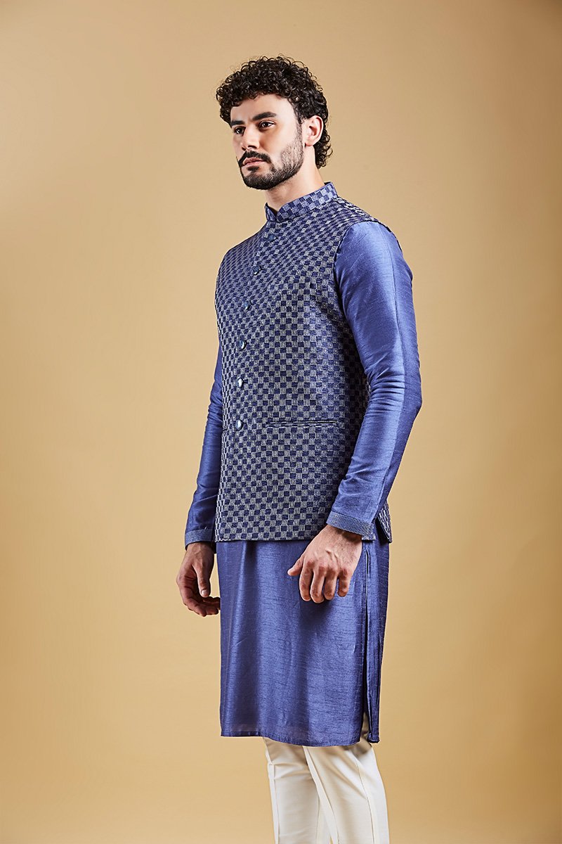 Designed for those who appreciate geometric precision and intricate craftsmanship, this Modi Jacket is elevated with Zari threadwork in Misty Rose hues, adding depth and texture to the classic checkered design. Whether worn at weddings, festive gatherings, or formal soirées, this jacket effortlessly blends tradition with contemporary flair.