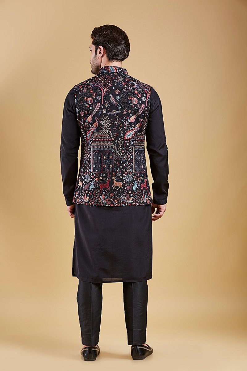 Black Jacket adorned with Multi-Coloured Thread in Pichwai Pattern