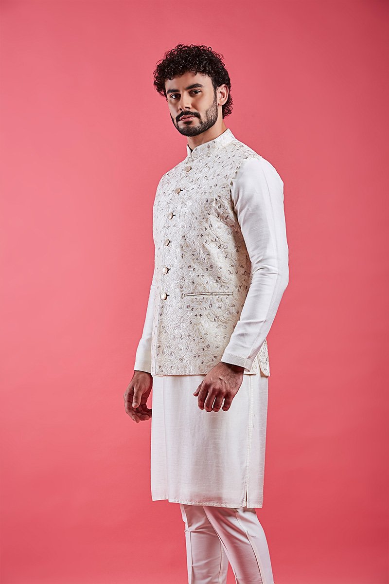 Perfect for weddings, cultural gatherings, and festive celebrations, this Modi Jacket seamlessly blends heritage craftsmanship with modern luxury. The intricate patterns, reminiscent of Persian motifs, add a touch of royalty, making it an exquisite choice for those who appreciate refined elegance.