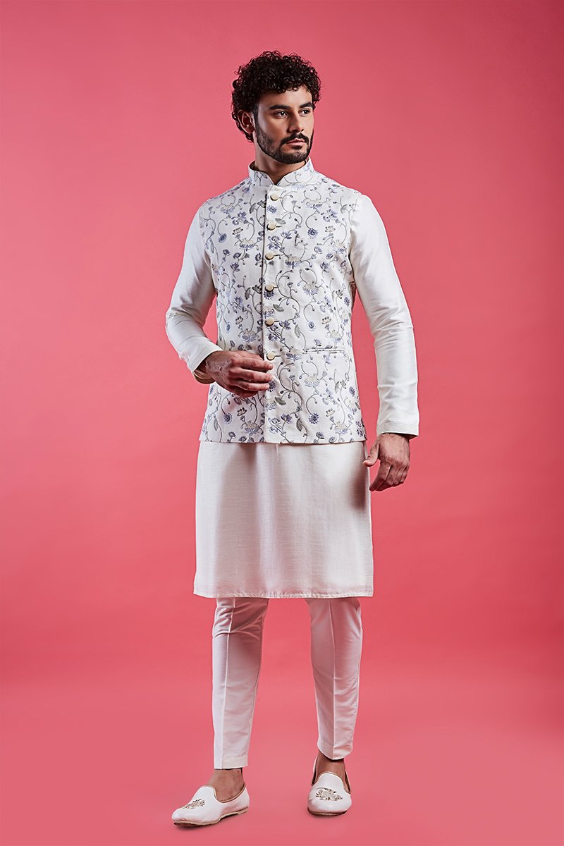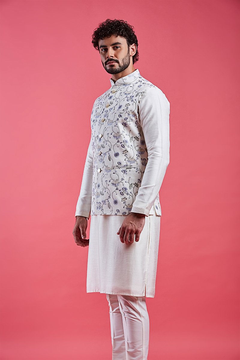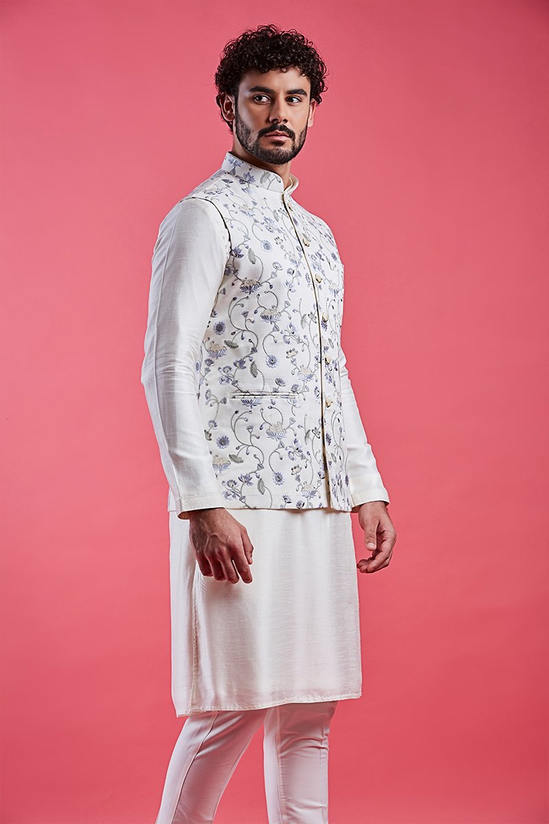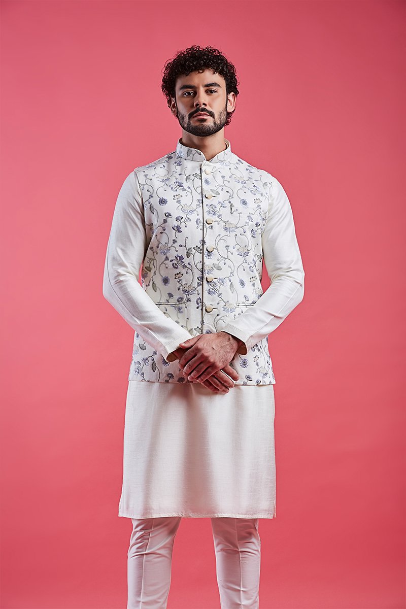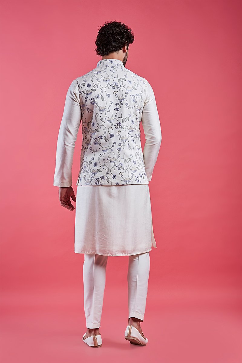 Perfect for festive celebrations, weddings, and grand occasions, this Modi Jacket blends heritage with contemporary elegance. The vibrant floral and vine motifs, delicately embroidered with resplendent threads, create a stunning visual symphony that captures attention effortlessly.