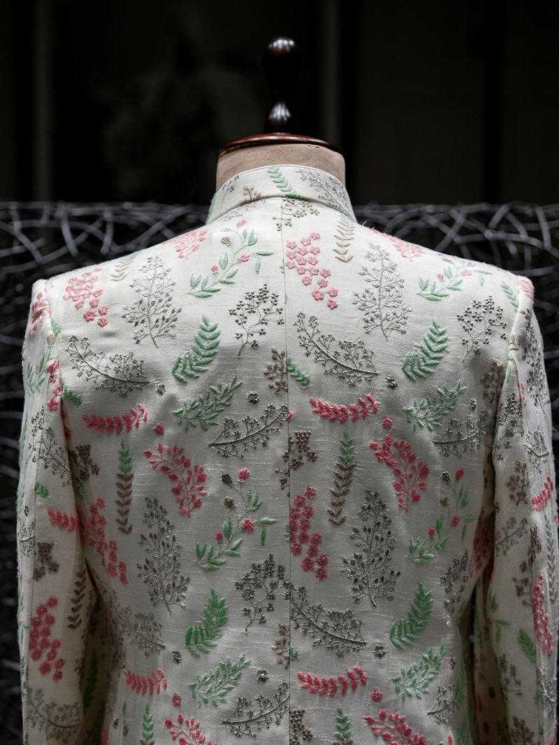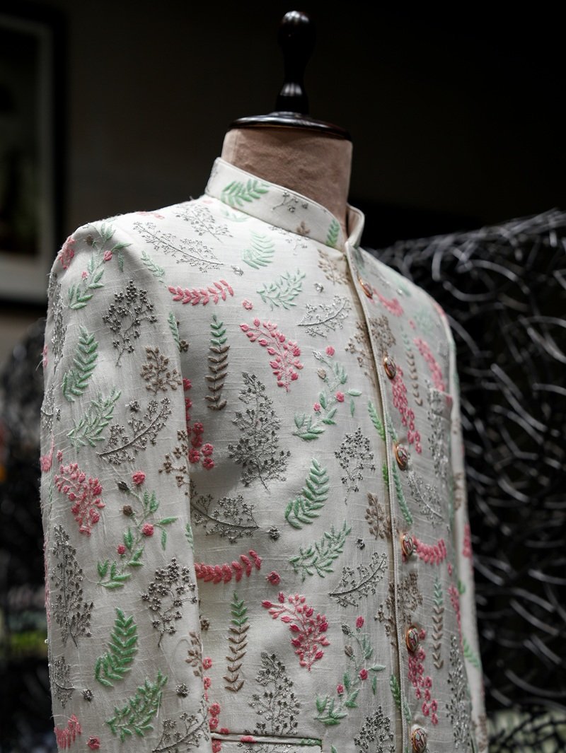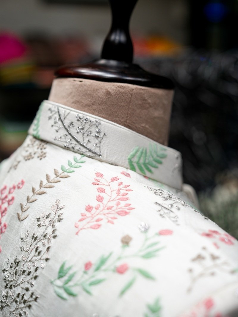 Embellished with an asymmetrical floral design, intricately crafted with alluring multi-colored cotton threads. Paired with Plain Cream Trousers.